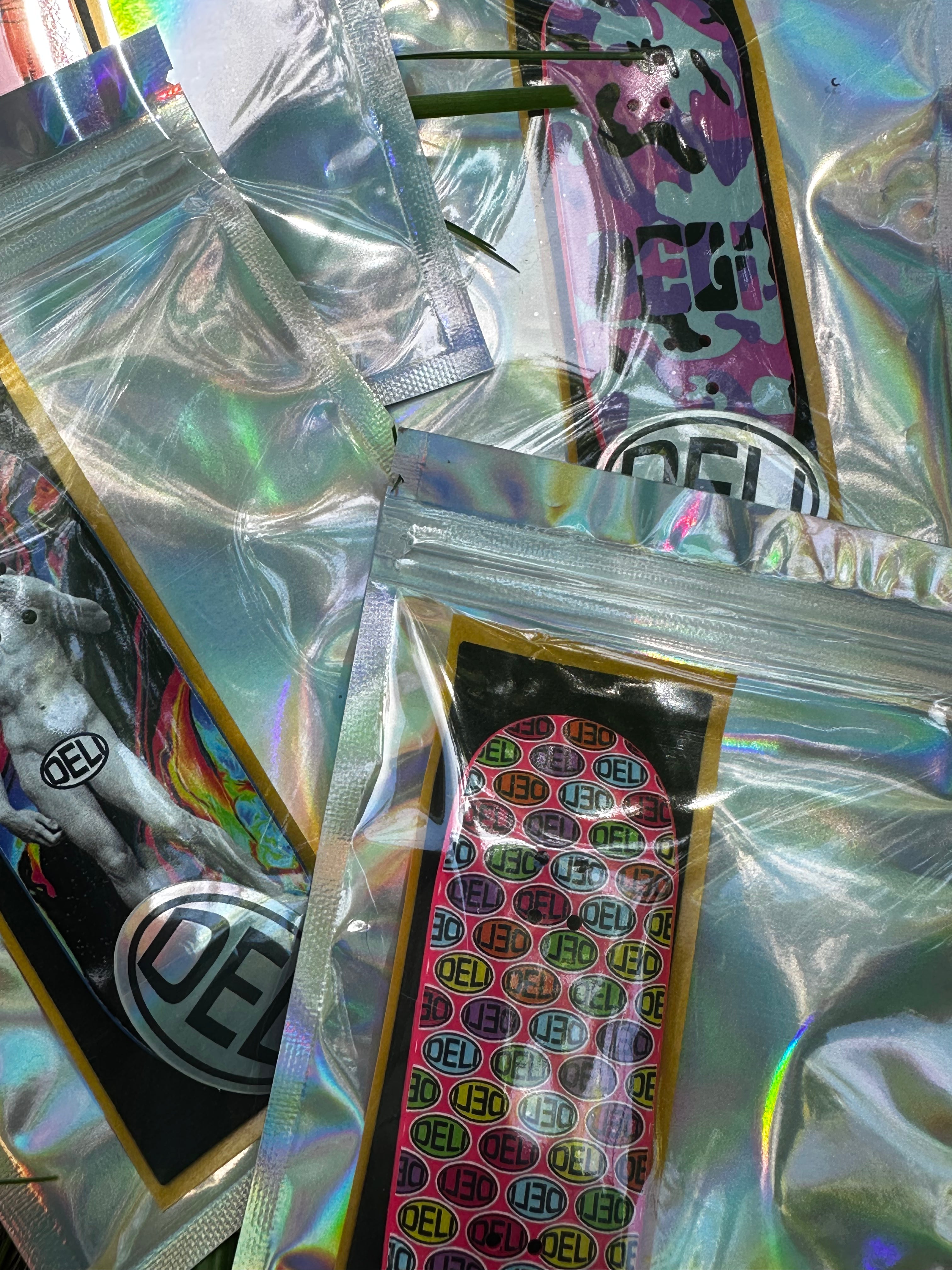Includes 1 holographic logo sticker and 1 sheet of fingerboard tape